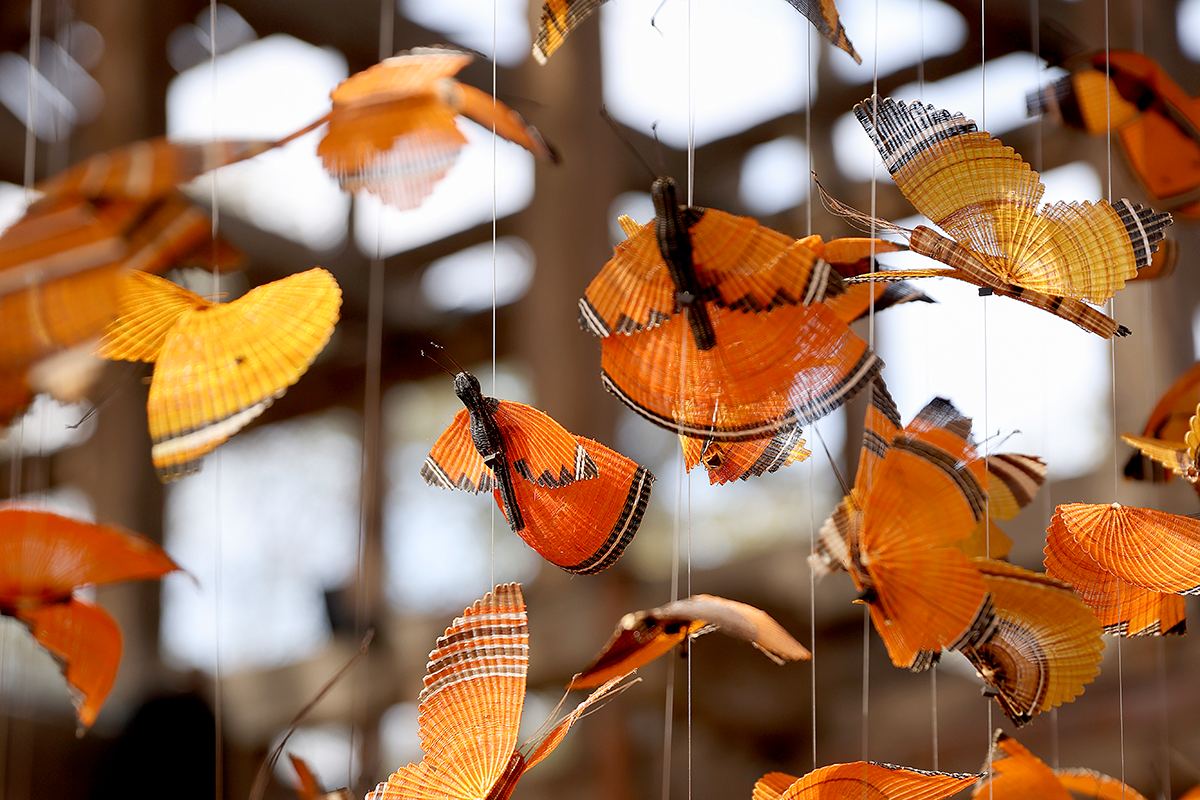 Como parte de su propósito de poner en valor el patrimonio cultural chileno, el Centro del Vino Concha y Toro inaugura su ciclo de exposiciones con una obra conmovedora: un mariposario tejido en crin -pelo de cola de caballo- por 16 mujeres artesanas de Rari, en la región del Maule. La instalación, formada por un disco de cuatro metros de diámetro que sostiene más de 1.300 mariposas hechas a mano, evoca el vuelo migratorio de la especie Vanessa carye, conocida como “Mariposa de la Tarde” o “Mariposa Colorada”.